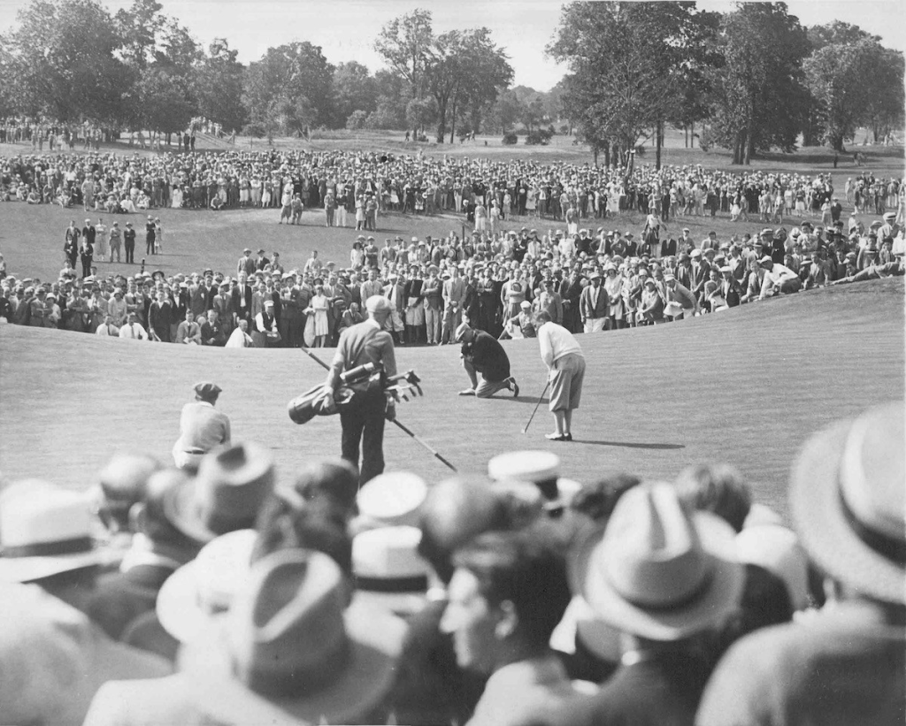 Jones nails 12 foot par putt (pictured above) on the 18th hole of the final round to force 36 hole playoff with Al Espinosa which Jones dominates by 23 strokes to win his third US Open title.
