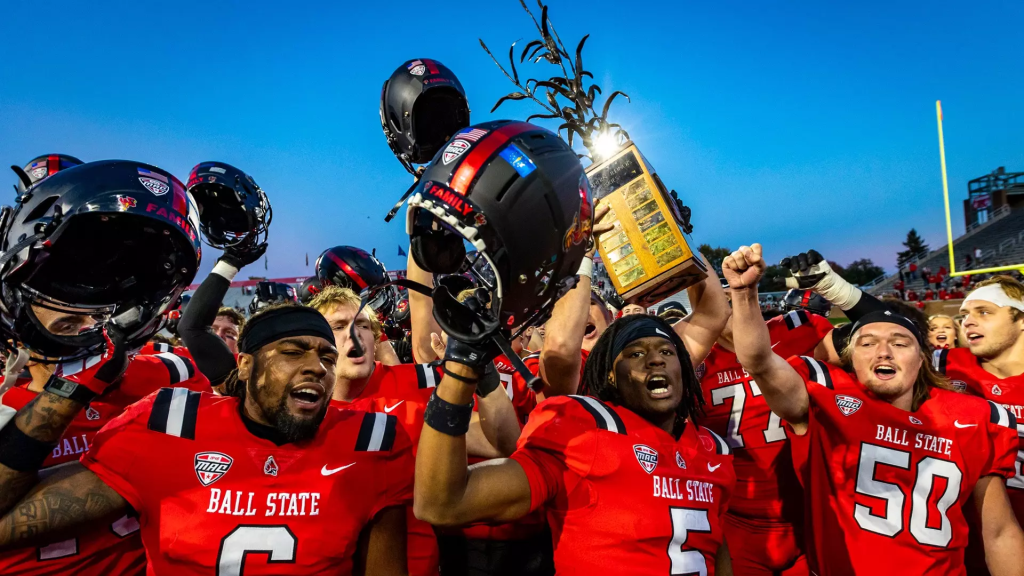 15. Northern Illinois has been upset by Ball State in three straight seasons– Starting this column, with a truly random tidbit! Three game win streaks over a particular opponent are quite common in this sport, but rarely do you see such a streak include three upsets. Even more interesting, the upsets have increased in size each season. Ball State upset NIU as a 4 point dog in 2022, as a 9 point underdog in 2023, and as a 12 point underdog in 2024. And most expect Ball State to be a sizable underdog again when they travel to Dekalb for their October 25th matchup against NIU in 2025. These two teams are also considered rivals in that they play for the Bronze Stalk Trophy every season (see photo below).