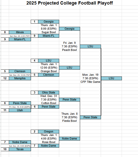 Every summer since 2007 I have created an intricate set of college football predictions for each upcoming season. This year is no exception, as I will be using my blog over the next few weeks to publish my 19th annual college football preview guide which will contain 19 entries in all. I have copied and pasted my entire projected College Football Playoff bracket below and then wrote a chronologically arranged project weekly schedule based on this year’s television spots beneath that. Please feel free to comment or debate.