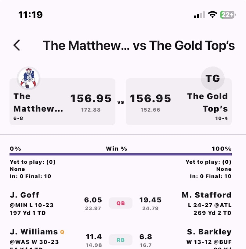 This last moment is still very fresh and raw occurring over the past few hours. In 2018, I thought my fantasy football fortunes couldn’t get worse, as I placed four different teams in fantasy super bowls in four different leagues and then proceeded to lose all four championship games. This year, my wife and I collectively beat that mark so to speark, as we had five fantasy super bowl teams between us (including her first two teams ever to make it to a fantasy super bowl), and we then proceeded to lose all five championship games. The loss in my dynasty league may be the most gut wrenching in the history of fantasy football, as I led the entire weekeknd over my opponent, until the second half surge by Matthew Stafford on Monday Night Football brought us to a tie to the hundreth of a digit (see scoreboard above)! The tiebreaker was highest playoff seed which did not go my way.