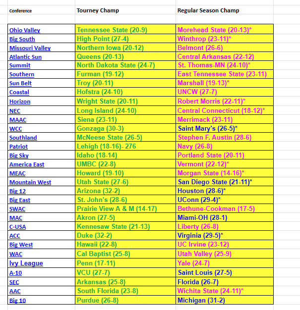 The 128 team tournament field I am proposing features 62 automatic bids (two going to each Division 1 conference) and 66 at-large teams. As mentioned previously, both the regular season and tournament champion from each conference would be given automatic bids to the NCAA tournament. Obviously, there will always be some circumstances when the same team wins both the conference regular season and postseason in which case the regular season runner-up from that league would earn the second at-large berth Using 2026 as a model, here is a table of which 62 teams would earn automatic bids to this year’s tournament based on this criteria. The teams in green font below are the ones who earned auto bids under the current tournament format. The teams in blue font are ones who earned at-large bids to this year’s tournament but would receive automatic bids based on my proposed format. And the teams in pink are the ones who were not given invites to this year’s Dance but would under this 128 team model. Also, teams with an asterisk next to their names in the “regular season champ” column are schools who were not regular season conference champions but because that league’s tournament champ also won their regular season title, they would receive the second automatic bid for that conference by virtue of being the regular season runner-up.