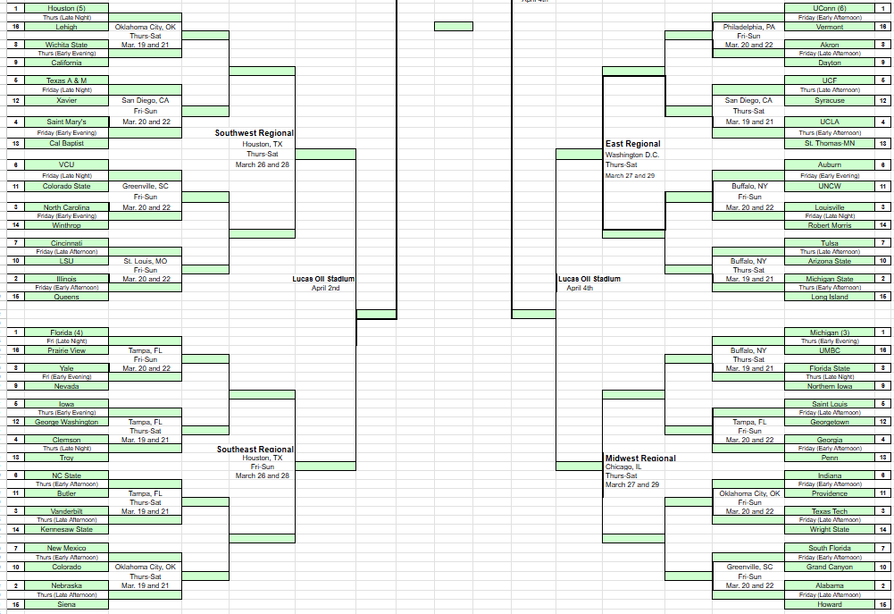 Regional Semifinals: One other neat aspect of the scheduling of games within my proposal is that we would have more daytime basketball during the week! As described above, each of the four locales set aside for second weekend games would host two different sets of regional semifinals. For instance, this season Houston would have hosted one set of regional semifinal games on Thursday (Southwest Regional) and another set on Friday (Southeast Regional) instead of having just the one set of Thursday games. I think the start times for this round could ultimately be set up like the current second round with one featured game at each time slot on both Thursday and Friday afternoons and then six additional games scattered throughout the evening each night.