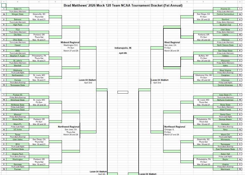 First Round (first Thursday and Friday): Eight different games will be played in each time slot at all eight different site locations on both days under my proposal. This would allow for each time slot to have every type of NCAA tourney game (1/16, 2/15 3/14, 4/13, 5/12, 6/11, 7/10, and 8/9) going on at the same time, which has to get you excited. No more “dull” time slots where you have a 2-3 blow out 1 vs. 16 and 2 vs. 15 games and maybe one semi-close 7 vs. 10 contents. Instead, with eight games going on at once all over the bracket, you are guaranteed to have some drama. Here is what that would look like based on the 128 team bracket I created for this year’s tournament.