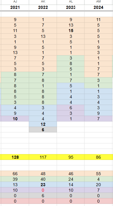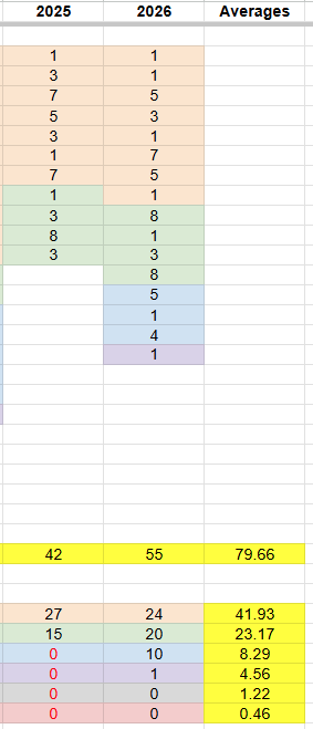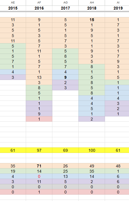 My raw data is displayed in the eight diagrams below. Under that, you will see the results of my analysis and conclusions as to which tournaments have produced the most/least upsets and best/worst upsets (based on total seed differential) overall and for every round of the tournament. Every upset for each tournaments is listed under the respective year on this spreadsheet. They are color coded by round and the numerical value in each cell is the seed differential for that upset. For instance, 16 seeded UMBC beat top seeded Virginia in the first round of 2018, so there is a 15 seed differential for that upset that will be listed in light orange (the color of the first round) for the 2018 column. By adding up all of the seed differentials for a particular tournament you can determine that tourney’s “upset quotient” which is highlighted in yellow below the list of the individual upset values. Without further ado, here is the full list of upsets by tournament since the field expanded to 64 teams updated to include the 2026 results.